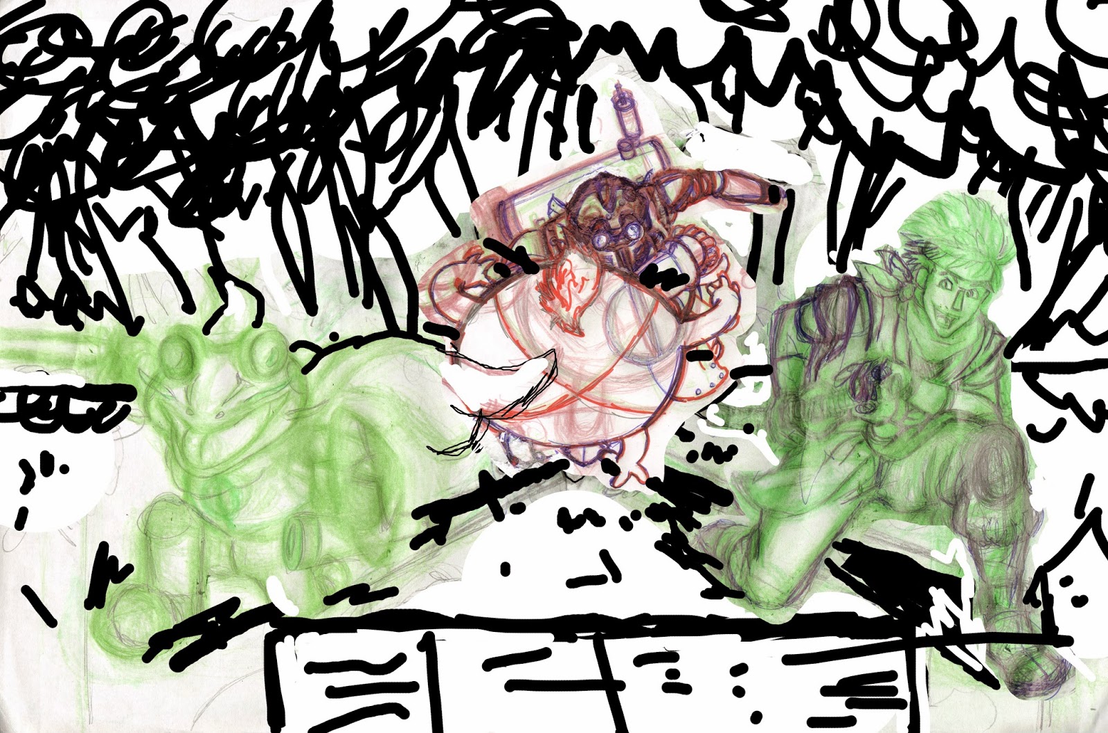 Here is some progress on my Shinji picture and a new sketch for an action shot of my favorite team in Chrono Trigger.